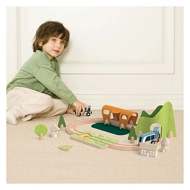 Wanneer de trein het station bereikt, rinkelt er een bel voor extra speelplezier. Daarnaast kunnen kinderen massief houten blokken stapelen om huizen in verschillende vormen te bouwen, die rondom het spoor kunnen worden geplaatst. De viltbomen en andere losse elementen nodigen uit tot fantasierijk spel en stimuleren creativiteit, taalontwikkeling en rollenspel. Tegelijkertijd worden fijne motoriek en coördinatie op een speelse manier geoefend.