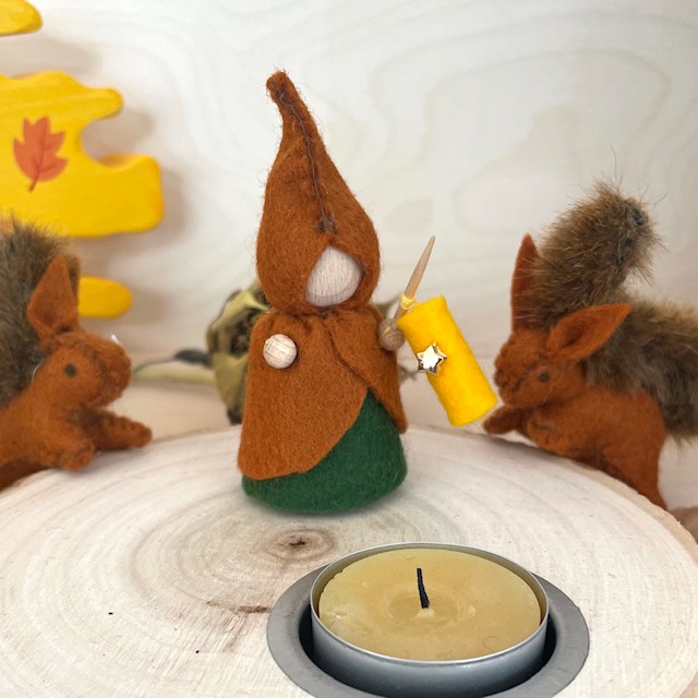 Kant en klaar popje van wollen vilt, lief kaboutertje met een wollen jasje aan, kan zo op de seizoenstafel met Sint Maarten