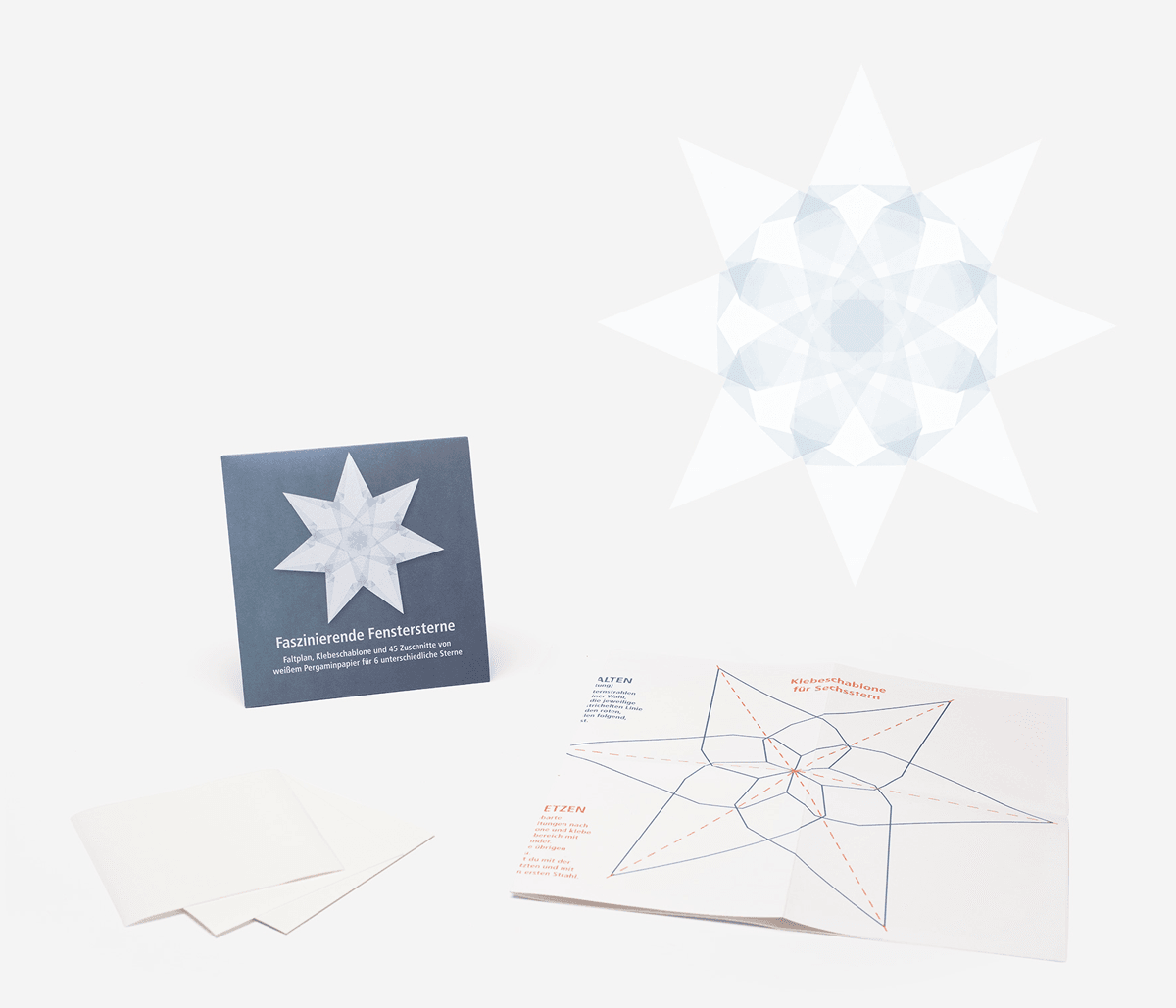 De complete set bevat 45 vellen nauwkeurig gesneden pergamijnpapier voor zes lichtgevende raamsterren met een diameter van ongeveer 20 cm.