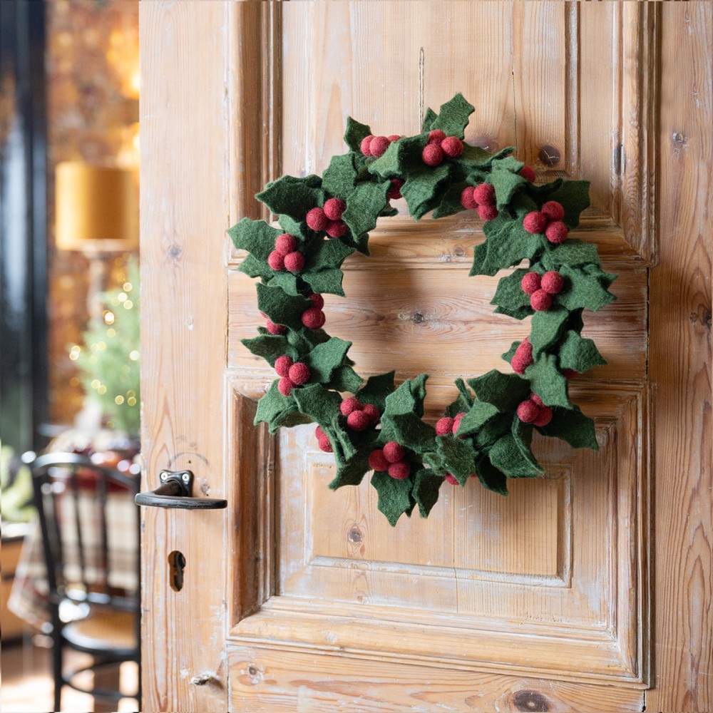 Een grote krans met een metalen ring en volledig gevuld met vilten hulstblaadjes en rode besjes. Erg leuk om met deze krans je huis in kerstsfeer te brengen!