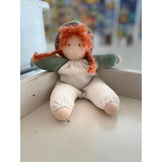 Dit zakpopje is Ā gemaakt van katoen , een hoofdje van katoenen tricot Ā en gevuld met gewassen schapenwol.
